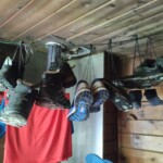 Když už jsme byli na místě, dali jsme v hospůdce oběd a až po něm se vydali na další cestu. Měli jsme dojít k chatce skryté kdesi v lesích, jejíž zahrada se měla stát na následující noc naším tábořištěm. To jsme však ještě netušili, co nás čeká. S postupujícím odpolednem se nebe zatmělo a začalo se v něm zlověstně blýskat. Pokračovali jsme tedy zrychleným tempem v cestě, našemu osudu jsme však uniknout nemohli. Nebyli jsme ještě ani zdaleka na křižovatce, kde jsme se měli setkat s učiteli, když se spustila průtrž mračen. Ponča a pláštěny, doma tak s jistotou balené, se náhle staly jen chabou ochranou před běsnícími živly. Lesní cesta se pod našima nohama během několika minut změnila v blátivý potok a naše boty se daly brzo označit za přenosné rybníky. Kromě toho chvílemi vázla komunikace s učiteli, kteří sice některým z nás volali, dotyční členové však měli vypnuté vyzvánění. Nakonec se však s námi spojili a podle jejich pokynů jsme se setkali na již předem určeném rozcestí. Zde jsme zjistili, že zdaleka nesme jediní, kdo značně promokl. Po kratší cestě a chvílích, kdy panovaly obavy, zda chatku vůbec najdeme, jsme však stanuli u naší záchrany: suché chaty, ve které se dalo zatopit, a od které jsme navíc měli klíče. Překotně jsme se namačkali dovnitř a po rozdělání ohně v krbu jsme si kolem něj rozvěsili mokré oblečení a hlavně boty. Na otázku, zda máme náhradní obuv, se totiž rozhostilo jen výmluvné ticho a my tak museli doufat, že naše boty, které se daly ždímat, do rána alespoň trochu proschnou. Poté, co jsme se trochu vzpamatovali a provedli inventuru toho, která část našeho vybavení vlastně zůstala suchá, jsme se pustili do vaření večeře. Původním plánem obou skupin byly původně těstoviny, druhá skupina se však nakonec uchýlila k čínské polívce, zatímco naše se pustila do úkolu uvařit v ešusu těstoviny a následně v něm ohřát kupovanou boloňskou omáčku, kterou jsme si s sebou dovezli. Oběma skupinkám se jídlo zdárně povedlo a tak nikdo nezůstal o hladu. K večeru ti členové expedice, kteří ze sebe ještě vykřesali nějakou energii, hráli člověče nezlob se a povídali si v teple u krbu, zatímco znavenější část skupiny se už odebrala spát.