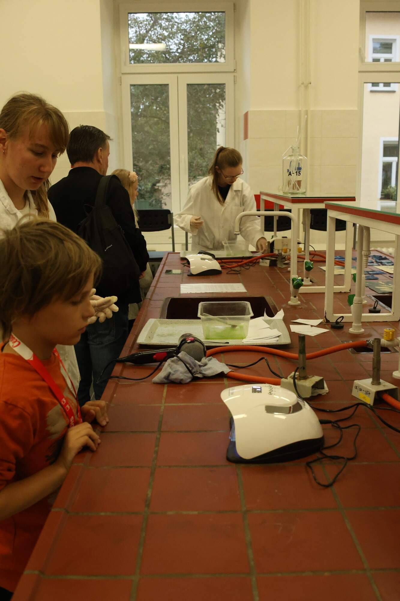 Chemie se na Noci vědců představila v modrých tónech – o kyanotypii čili fotochemický modrotisk byl mimořádný zájem. Návštěvníci, kteří se s touto starou metodou výroby fotografií setkali poprvé, byli fascinování, jak UV záření vykresluje na papír obrys negativu nebo přírodnin a poté se za pomocí vody obraz ustálí. Domů si tak většina z nich odnášela vlastnoručně vyrobené obrázky.