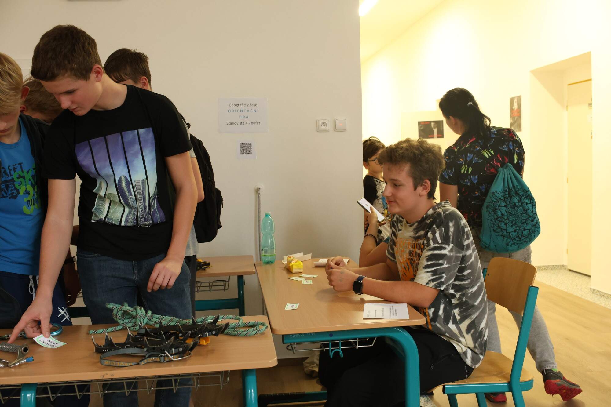 Hned po vstupu do školy čekala malé i velké napínavá zeměpisně-sportovní hra, ve které se pomocí map, plánků, turistických značek, QR kódů a dalších indicií, snažili najít stanoviště rozmístěná po celé škole. Na stanovištích byly připravené úkoly, a to jak zeměpisného charakteru, tak i ze světa sportu. Jakmile návštěvníci obešli všechna stanoviště a splnili úkoly, dostali zaslouženou sladkou odměnu. Zajímavá hra pohltila hlavně mladší ročníky. Starší si přišli poslechnout a také se aktivně zapojili do povídání o cestování v učebně zeměpisu.