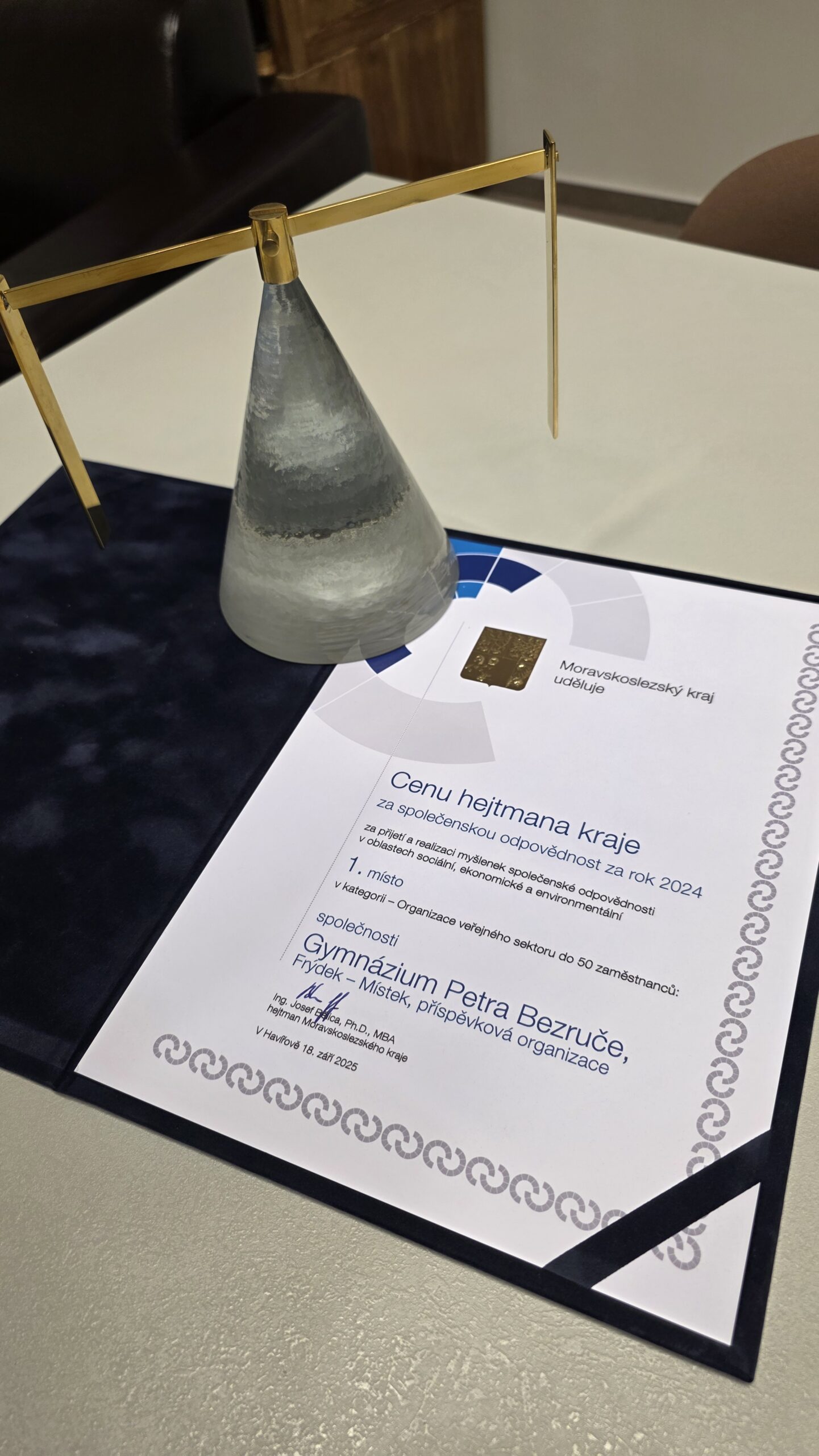 Ve čtvrtek 18. 9. 2025 naše gymnázium získalo Cenu hejtmana Moravskoslezského kraje za společenskou odpovědnost za rok 2024. Slavnostní galavečer proběhl v Kulturním domě Petra Bezruče v Havířově. První místo jsme obdrželi v kategorii „organizace veřejného sektoru do 50 zaměstnanců.