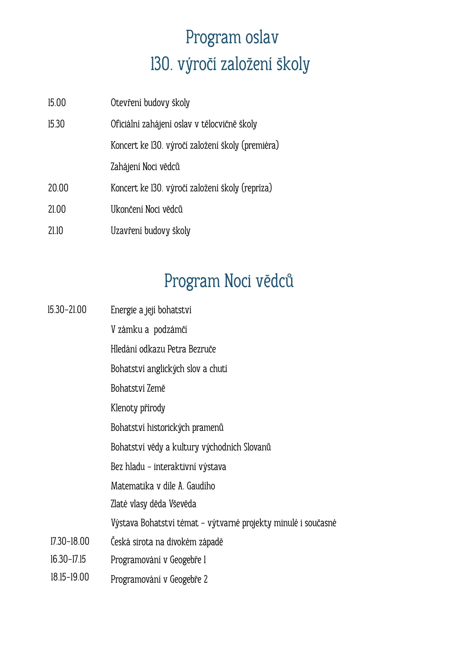 Už za necelých 24 hodin se naše budova otevře široké veřejnosti. Během odpoledne a večera budete mít možnost s námi nejen oslavit 130. výročí založení naší školy, užít si koncert, podívat se do prostor gymnázia a zavzpomínat, ale také budete opět moci prožít odpoledne, večer a noc plnou vědy a bádání, tentokrát na téma BOHATSTVÍ. Program je bohatý a věříme, že každý si najde něco, co jej zaujme.