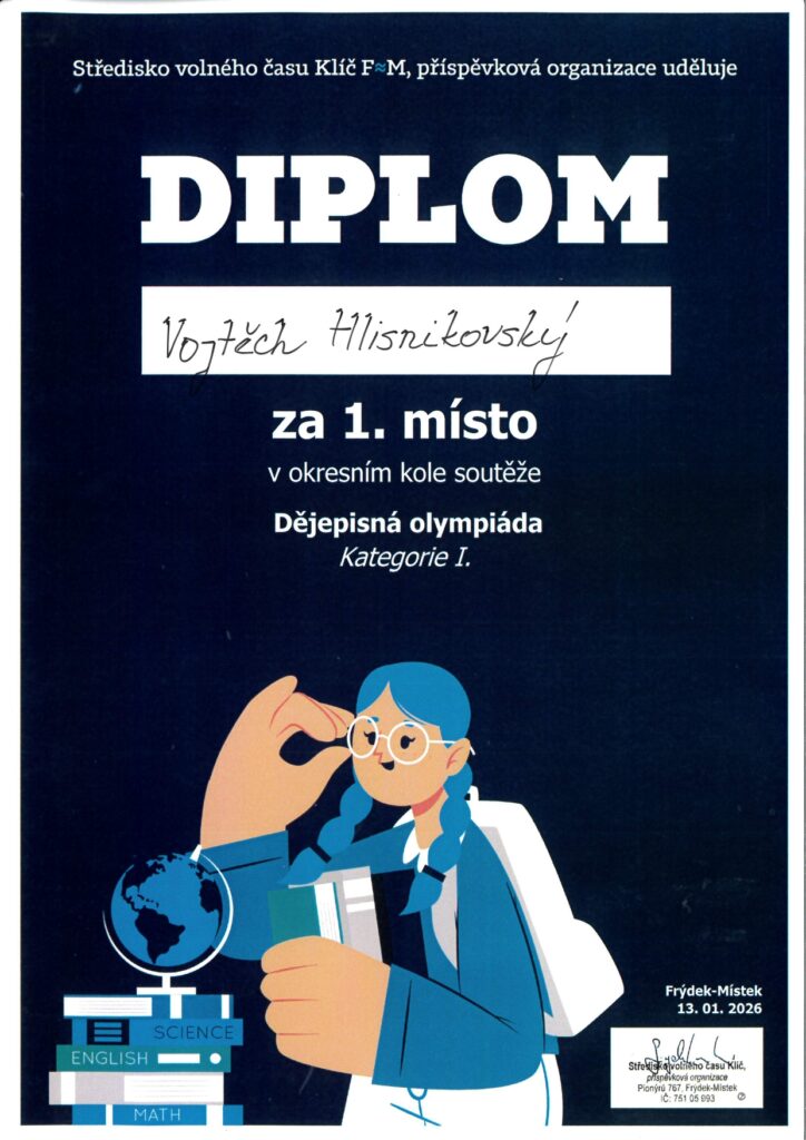V úterý 13. ledna 2026 proběhlo na ZŠ Jiřího z Poděbrad a na Gymnáziu Cihelní ve Frýdku okresní kolo 55. ročníku Dějepisné olympiády. Letošní ročník soutěže měl následující téma: Dvě strany téhož příběhu: Jak muž a žena kráčeli dějinami – spolu, proti sobě i vedle sebe.